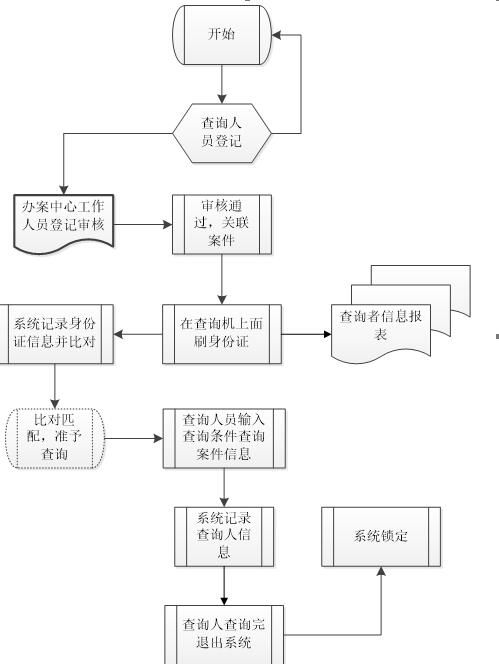 前台查询过程:案件查询人员第一次登陆系统查询案件信息时,在工作人员处登记个人身份信息,并关联欲查询案件的编号;查询人员到查询机上刷身份证,系统匹配信息,匹配成功后进行查询,以后每次查询本案即可直接刷身份证查询。系统自动对每次查询人查询的信息进行记录,一个查询人员关联多个案件时,显示案件列表,选择需要查询的案件进行查询。