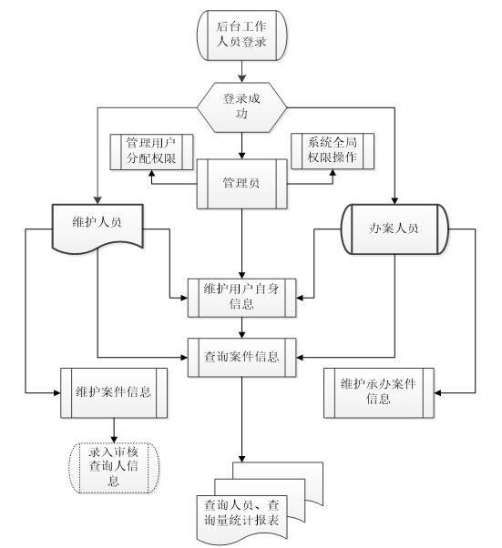 后台管理业务涉及三类用户:管理员、信息维护人员、案件侦办人员。管理人员具有全局权限;信息维护人员可以对案件信息进行增删改查,审核前台查询人员信息,浏览查询报表,案件信息;案件侦办人员可对自己负责的案件信息进行增删改查,调阅其他案件信息。